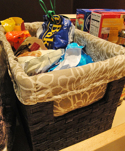 Baskets are key to organizing your cabinets. All those little packets and Tastefully Simple mixes get thrown straight into my baskets. This one is on my pantry’s baking shelf so it holds those half empty packages of nuts, white chocolate chips, and pudding. This is a CD basket from Target’s paper rope line. It fits perfectly in my pantry so naturally I have a million of them.