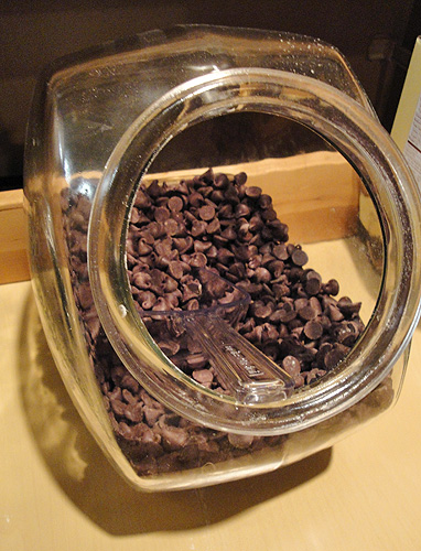 I use an old cereal container and scoop I bought from Target to hold chocolate chips. Yes, I bulk buy chocolate chips. I do in fact use that many and if you do too, a cereal container is a great way to store them all.