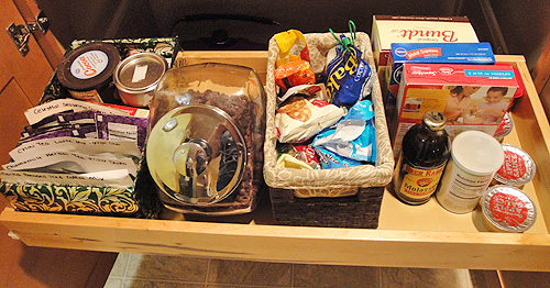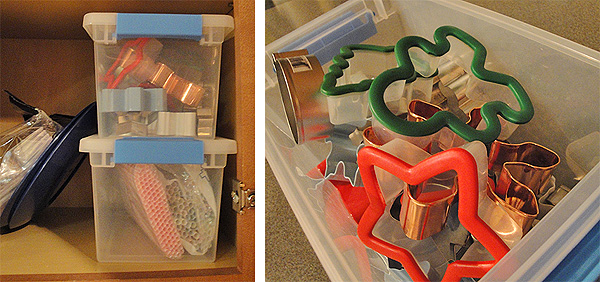 If I’m not careful, I can get messy very quickly with all those paper products in my cabinets. So I buy totes and hide it all away. One holds utensils, plates, and napkins. Another holds straws for summer parties. Yet another holds cookie cutters. I’ve tried plastic bags and the like but the only way I don’t have a crazy cabinet is by locking them all up.