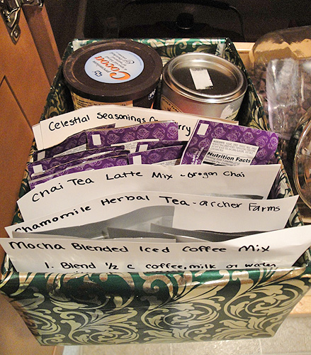 You don’t have to spend money to organize. I took a shoe box from the running shoes for my giant feet and wrapped it in some wrapping paper. I used scrap paper from printing out coupons to make some dividers and now my teas, coffee mixes, and cocoa have some storage of their own. All for the price of nothing! (except the shoes)