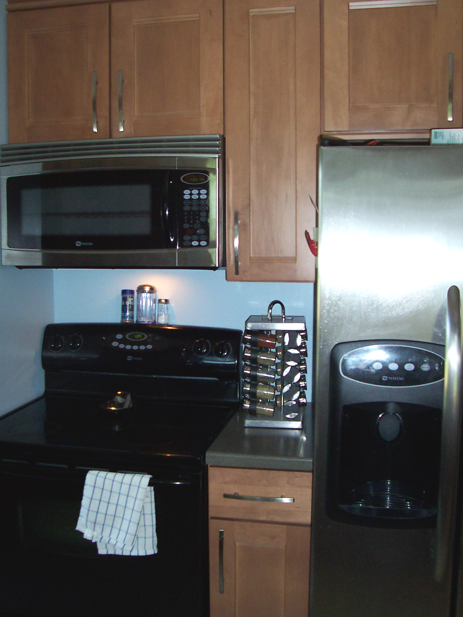 After that we had the long process of waiting. When the cabinets arrived they had to be inspected for defects before they could be installed. The installation took only about 3 days but we ran into an issue where one cabinet was the wrong size (but not defective so it was missed in the inspection) so they had to reorder it. While we waited we bought handles but the downside was that our counters would be delayed until the new cabinet arrived and could be installed. Finally the new cabinet arrived and we could schedule our countertop measure. Another 10 days from the measure and we got our counters in. It took over 2 months from start to finish while we lived with just a laundry sink, a stove, a fridge, and a card table as a counter. Be prepared to rough it folks. But here was the result of all the wait: